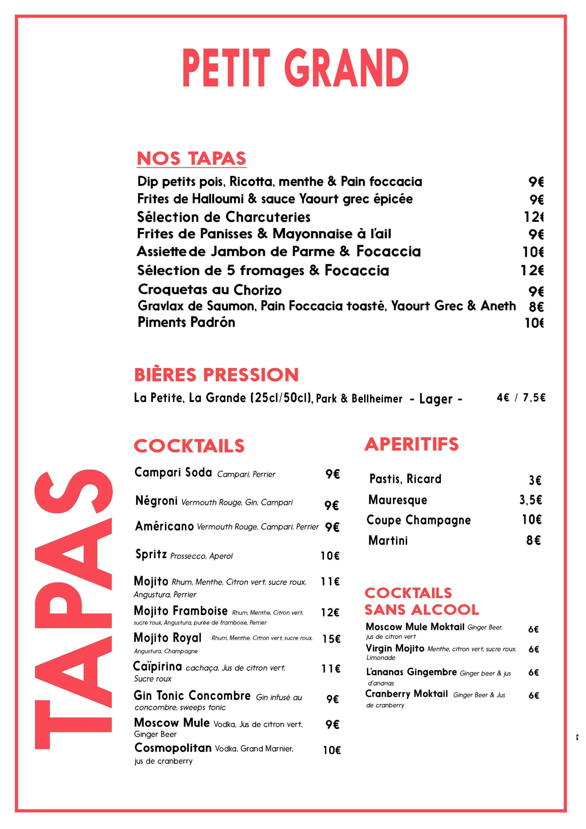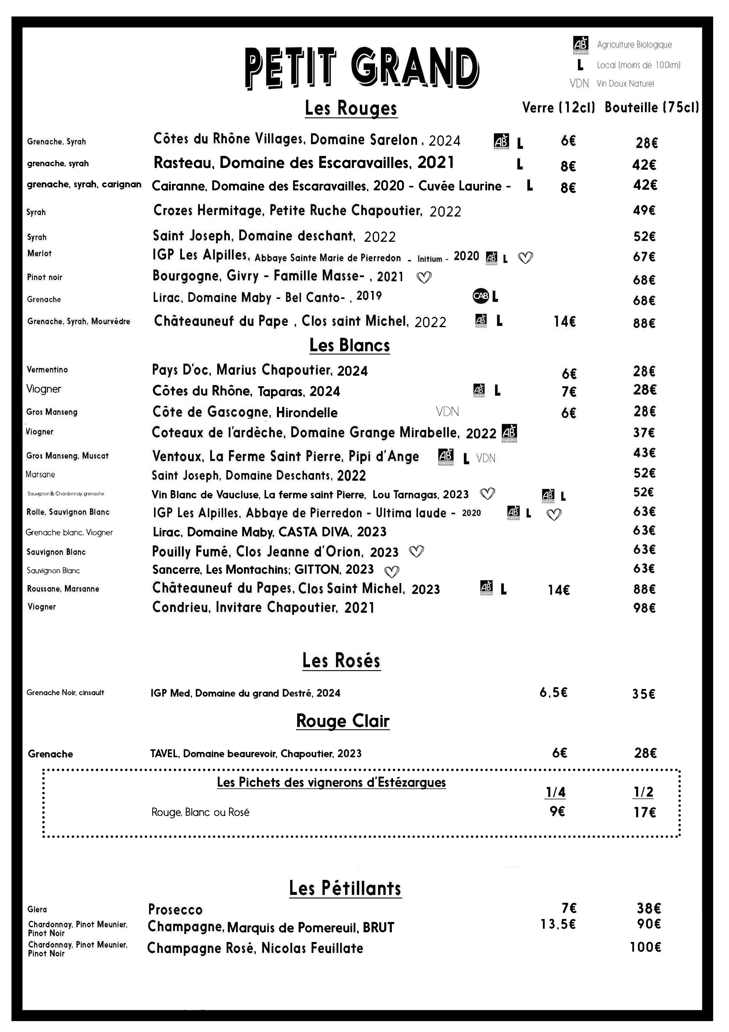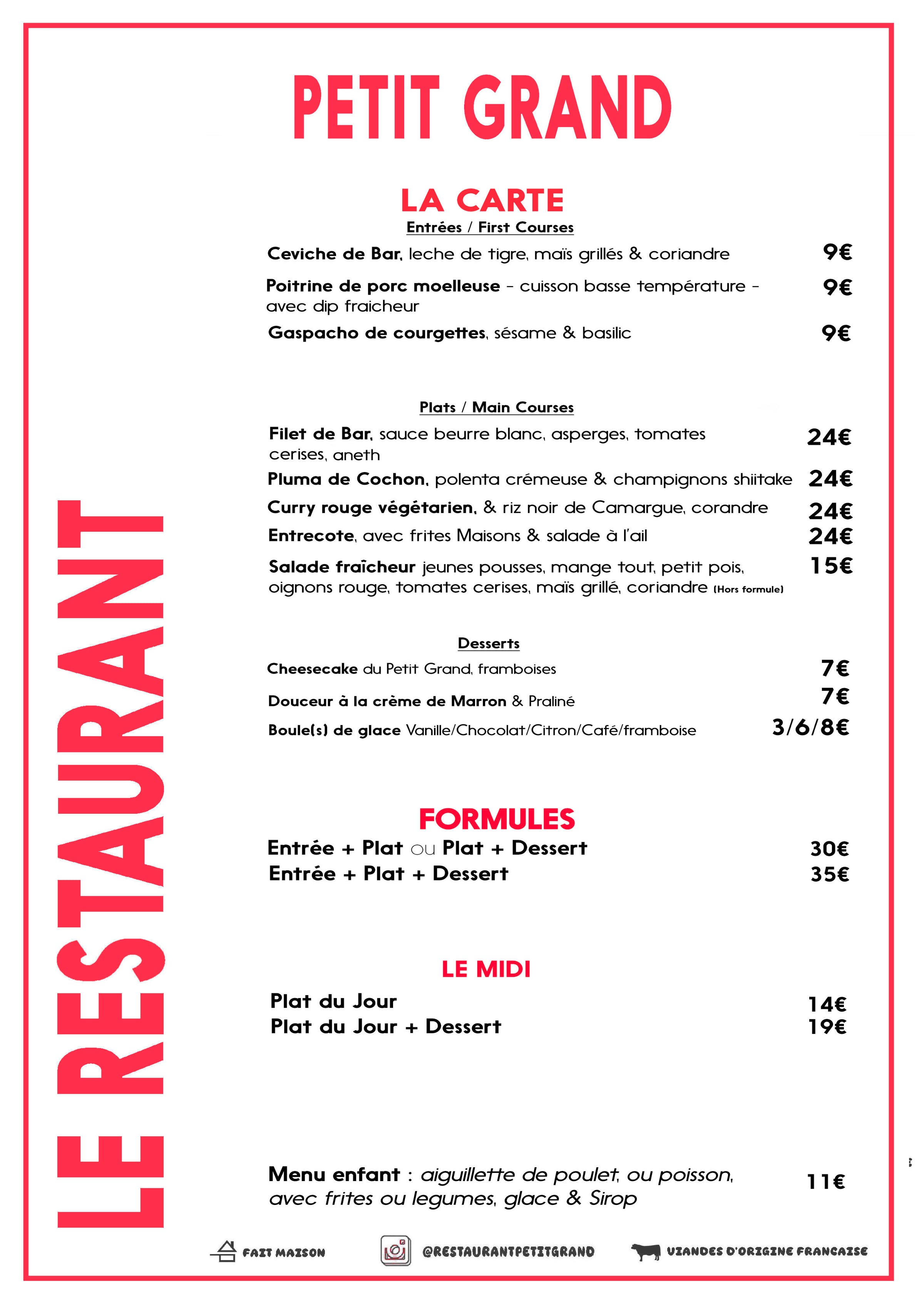 Le Menu Le Restaurant Petit Grand propose des petits plats à partager et des grand plats dans une carte sélective (3 entrées, 3 plats et trois desserts).