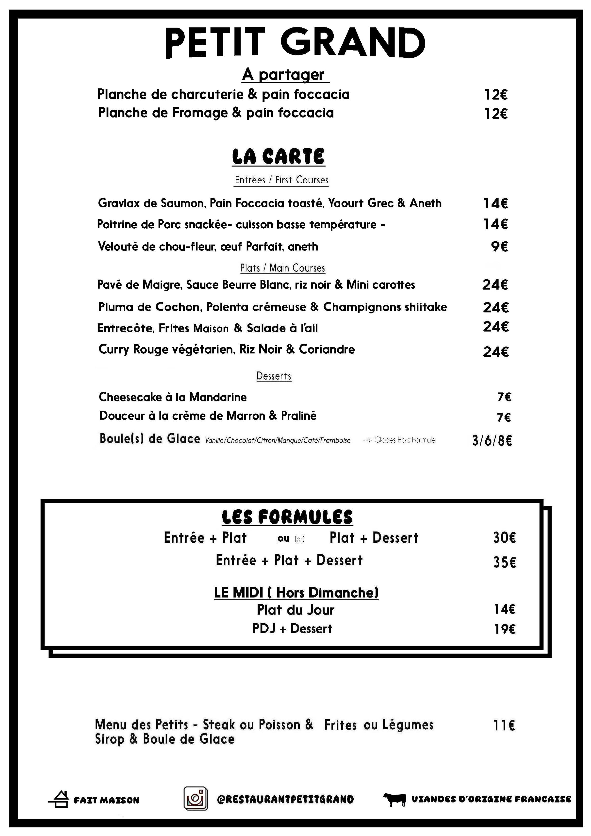 Le Menu Le Restaurant Petit Grand propose des petits plats à partager et des grand plats dans une carte sélective (3 entrées, 3 plats et trois desserts).