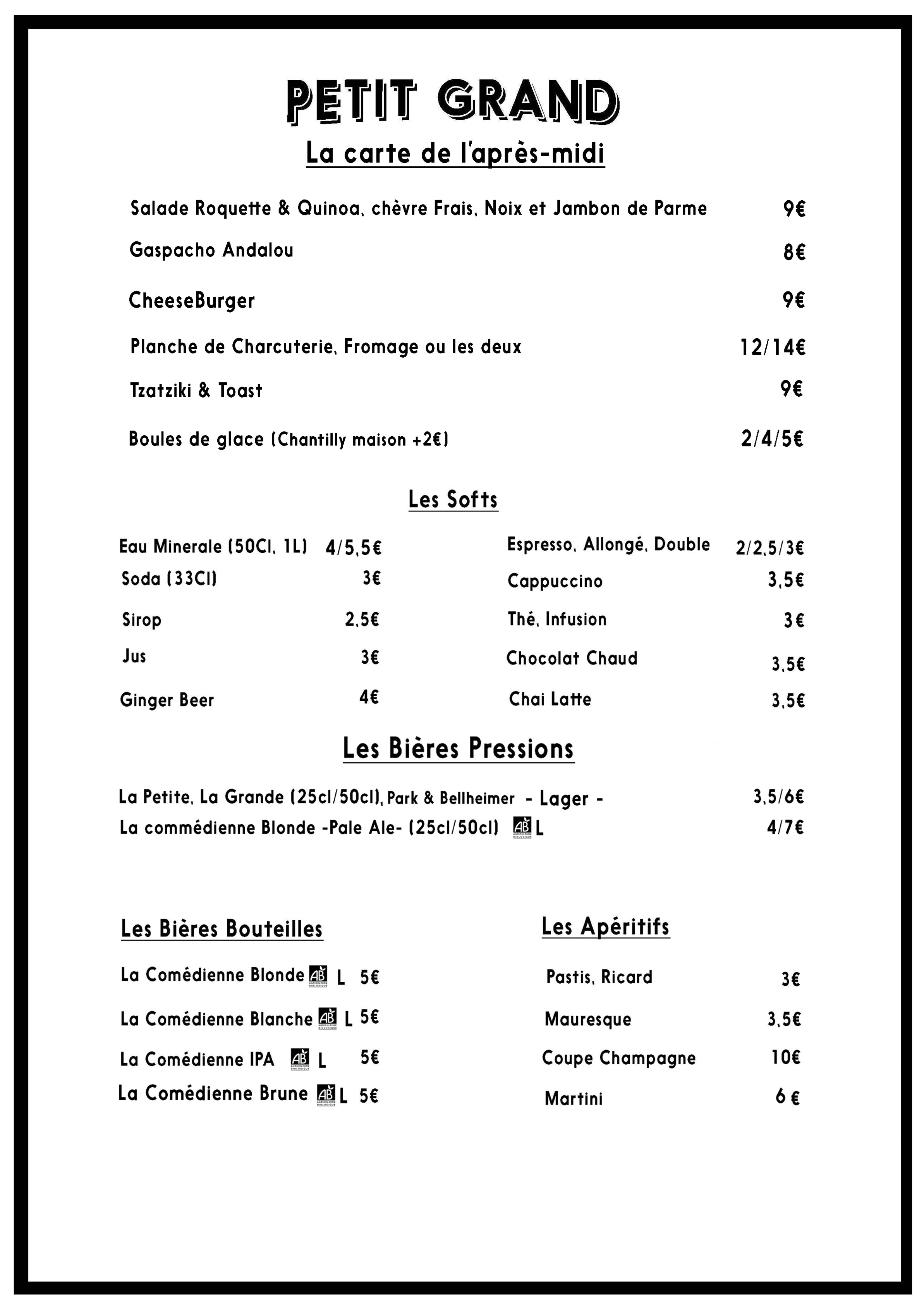 Le Menu Le Restaurant Petit Grand propose des petits plats à partager et des grand plats dans une carte sélective (3 entrées, 3 plats et trois desserts).