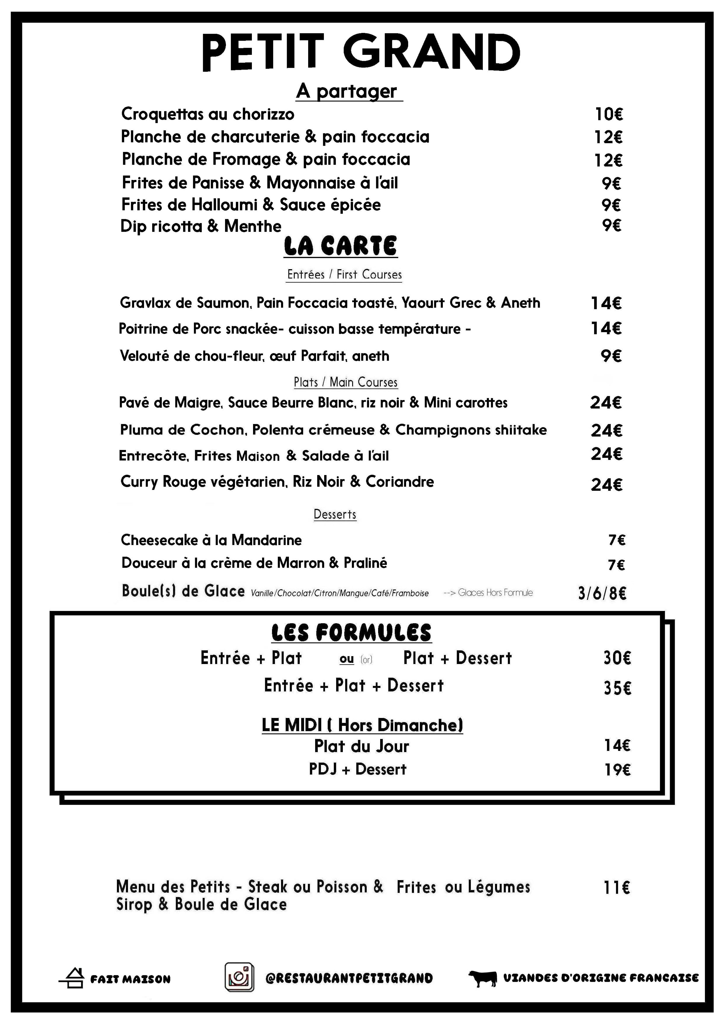 Le Menu Le Restaurant Petit Grand propose des petits plats à partager et des grand plats dans une carte sélective (3 entrées, 3 plats et trois desserts).
